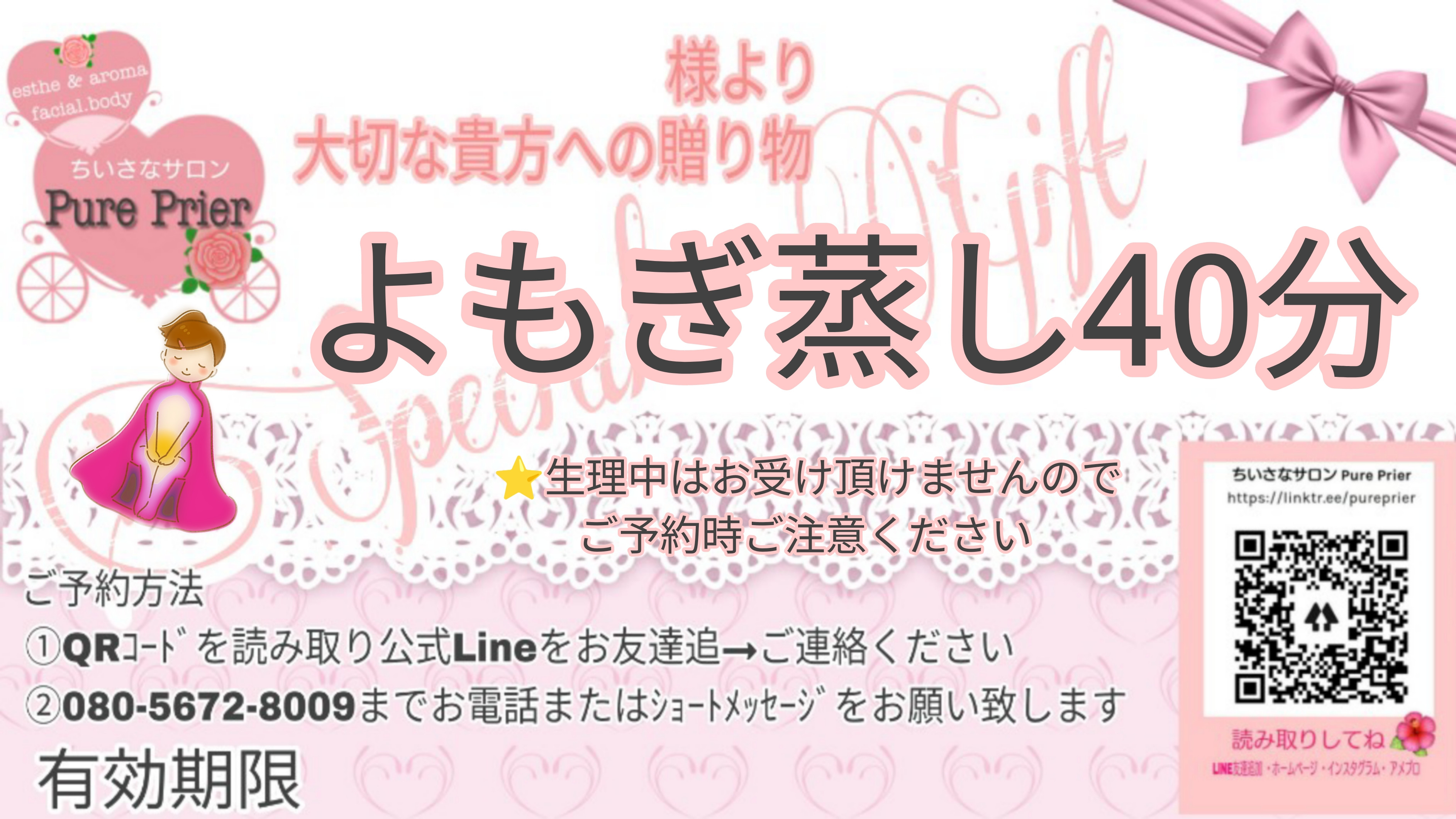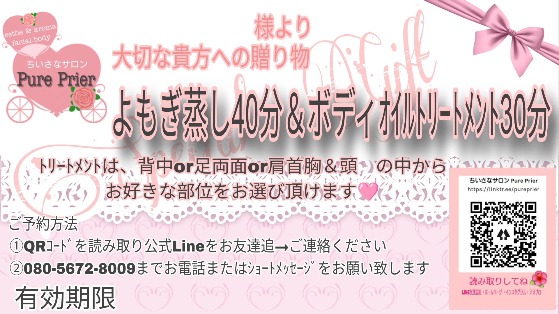 お誕生日、記念日、母の日、成人式などの贈り物に Pure Prierのケアを。大切な方に…ありがとうを伝えたい🩷笑顔にしたい🩷一層輝いて欲しい🩷そんな、貴方の温かな想いを伝える形として、お手伝いさせて頂きます✨️ 通常メニュー以外にも、ご予算に合わせてプランニング可です。貴方のお名前をお入れしたチケットを作成致します。(ペーパーチケットは別途110yen頂きます🙏デジタルチケットは無料) 事前にご相談頂けますと幸いです。